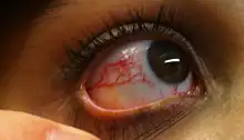 Prominent blood vessels (telangiectasia) over the white (sclera) of the eyes usually occur by the age of 5–8 years, but sometimes appear later or not at all.[8] The absence of telangiectasia does not exclude the diagnosis of A–T. Potentially a cosmetic problem, the ocular telangiectasia do not bleed or itch, though they are sometimes misdiagnosed as chronic conjunctivitis. It is their constant nature, not changing with time, weather or emotion, that marks them as different from other visible blood vessels. Telangiectasia can also appear on sun-exposed areas of skin, especially the face and ears. They occur in the bladder as a late complication of chemotherapy with cyclophosphamide,[15] have been seen deep inside the brain of older people with A–T,[16] and occasionally arise in the liver and lungs.[17]