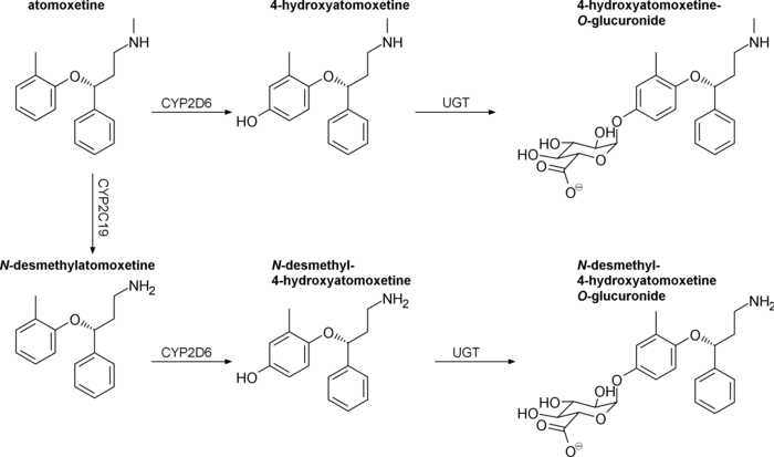 Atomoxetine is excreted unchanged in urine at <3% in both extensive and poor CYP2D6 metabolizers, with >96% and 80% of a total dose being excreted in urine, respectively.[7] The fractions excreted in urine as 4-hydroxyatomoxetine and its glucuronide account for 86% of a given dose in extensive metabolizers, but only 40% in poor metabolizers.[7] CYP2D6 poor metabolizers excrete greater amounts of minor metabolites, namely N-desmethylatomoxetine and 2-hydroxymethylatomoxetine and their conjugates.[7]