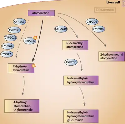 {{cite journal}}: CS1 maint: unflagged free DOI (link) - ↑ Belle DJ, Ernest CS, Sauer JM, Smith BP, Thomasson HR, Witcher JW (November 2002). "Effect of potent CYP2D6 inhibition by paroxetine on atomoxetine pharmacokinetics". Journal of Clinical Pharmacology. 42 (11): 1219–27. doi:10.1177/009127002762491307. PMID 12412820.