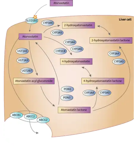 - ↑ Hermann M, Bogsrud MP, Molden E, Asberg A, Mohebi BU, Ose L, Retterstøl K (June 2006). "Exposure of atorvastatin is unchanged but lactone and acid metabolites are increased several-fold in patients with atorvastatin-induced myopathy". Clinical Pharmacology and Therapeutics. 79 (6): 532–9. doi:10.1016/j.clpt.2006.02.014. PMID 16765141.