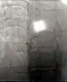 Percutaneous device closure involves the passage of a catheter into the heart through the femoral vein guided by fluoroscopy and echocardiography.[28] An example of a percutaneous device is a device which has discs that can expand to a variety of diameters at the end of the catheter. The catheter is placed in the right femoral vein and guided into the right atrium. The catheter is guided through the atrial septal wall and one disc (left atrial) is opened and pulled into place. Once this occurs, the other disc (right atrial) is opened in place and the device is inserted into the septal wall. This type of PFO closure is more effective than drug or other medical therapies for decreasing the risk of future thromboembolism.[28][48][49] The most common adverse effect of PFO device closure is new-onset atrial fibrillation. [50] Other complications, all rare, include device migration, erosion and embolization and device thrombosis or formation of an inflammatory mass with risk for recurrent ischemic stroke. [51][52]