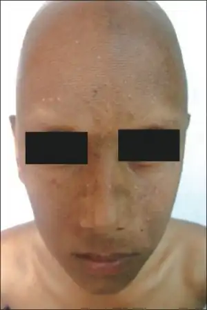 | Papular lesions on face; alopecia of scalp, eyebrows | |