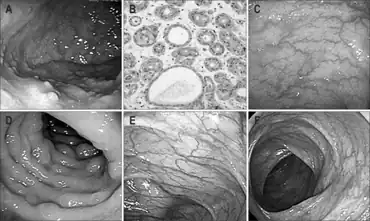 | a) Multiple fundic gland polyps b)dilated oxyntic glands c,d) multiple colonic polyps e,f) diminished colonic polyps at 1 year | |