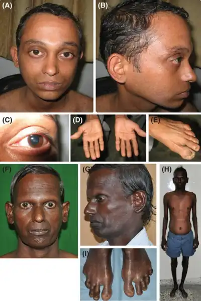 - ↑ 34.0 34.1 Huang S, Lee L, Hanson NB, Lenaerts C, Hoehn H, Poot M, Rubin CD, Chen DF, Yang CC, Juch H, Dorn T, Spiegel R, Oral EA, Abid M, Battisti C, Lucci-Cordisco E, Neri G, Steed EH, Kidd A, Isley W, Showalter D, Vittone JL, Konstantinow A, Ring J, Meyer P, Wenger SL, von Herbay A, Wollina U, Schuelke M, Huizenga CR, Leistritz DF, Martin GM, Mian IS, Oshima J (2006). "The spectrum of WRN mutations in Werner syndrome patients". Hum. Mutat. 27 (6): 558–67. doi:10.1002/humu.20337. PMC 1868417. PMID 16673358.