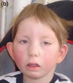 The syndrome has a characteristic facial appearance which is similar to that of Kabuki syndrome, including prominent, downward-displaced ears that are underdeveloped, long eyelids, epicanthic folds, a short, broad nose, an open, downturned mouth and a deep groove in the midline of the tongue.[4] Cleft palate occurs in about half of those affected.[4] There is sometimes webbing of the neck or bulging eyes, and less commonly there is excessive hair on the forehead or other parts of the body or a unibrow.[3][8] Individuals with the syndrome may also have a broad first toe and crowding of the toes,[1][7][8] and at least two affected individuals have had polydactyly of the fifth digit (postaxial polydactyly).[4][7] Some of those affected have had undescended testicles (cryptorchidism).[1][4] A small minority of those affected have had congenital joint contractures such as club foot.[1]