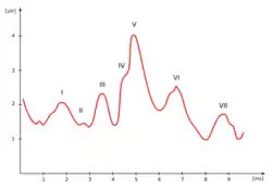 The auditory brainstem response (ABR), also called brainstem evoked response audiometry (BERA) or brainstem auditory evoked potentials (BAEPs) or brainstem auditory evoked responses (BAERs)[1][2] is an auditory evoked potential extracted from ongoing electrical activity in the brain and recorded via electrodes placed on the scalp. The recording is a series of six to seven vertex positive waves of which I through V are evaluated. These waves, labeled with Roman numerals in Jewett/Williston convention, occur in the first 10 milliseconds after onset of an auditory stimulus. The ABR is termed an exogenous response because it is dependent upon external factors.[3][4][5]