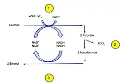 Fermentation is a biochemical process during which yeast and certain bacteria convert sugars to ethanol, carbon dioxide, as well as other metabolic byproducts.[13][14] The fermentation pathway involves pyruvate formed from yeast in the EMP pathway, while some bacteria obtain pyruvate through the ED pathway.[13] Pyruvate is then decarboxylated to acetaldehyde in a reaction involving the enzyme pyruvate decarboxylase.[13] Reduction of acetaldehyde to ethanol produces NAD+, which is catalyzed by alcohol dehydrogenase (ADH).[13] ADH rids the body of alcohol through a process called first pass metabolism.[7] However, if the rate of ethanol breakdown is less than the rate of production, intoxication ensues.