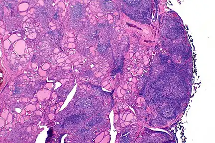 | The thyroid of someone with Hashimoto's thyroiditis as seen with a microscope at low magnification | |