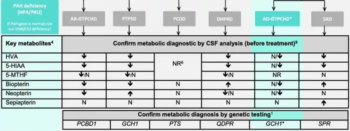 According to a consensus guideline on BH4 deficiency published in 2020, if the presence of AD-GTPCHD is suspected, a genetic assessment should be carried out to look for mutations of the GTPCH1 gene.[2] Genetic assessment requires specialized methods able to detect deletions, because in a significant number of patients with AD-GTPCHD no sequence alterations were found.[2] Furthermore, cerebrospinal fluid analysis of biogenic amines and pterins (Figure 1) should be performed to gain additional clues.[2]