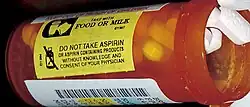 An auxiliary label (also called cautionary and advisory label or prescription drug warning label) is a label added on to a dispensed medication package by a pharmacist in addition to the usual prescription label. The purpose of these labels is to offer additional information about the safe administration, use, and storage of the medication.[1] While auxiliary labels can enhance understanding, they should not be considered a substitute for verbal counseling from a pharmacist.[2]