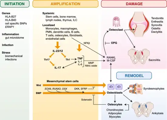 32. 32.0 32.1 Taurog JD, Chhabra A, Colbert RA (June 2016). "Ankylosing Spondylitis and Axial Spondyloarthritis". The New England Journal of Medicine. 374 (26): 2563–74. doi:10.1056/NEJMra1406182. PMID 27355535.