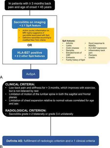 33. 33.0 33.1 Poddubnyy D, van Tubergen A, Landewé R, Sieper J, van der Heijde D (August 2015). "Development of an ASAS-endorsed recommendation for the early referral of patients with a suspicion of axial spondyloarthritis". Annals of the Rheumatic Diseases. 74 (8): 1483–7. doi:10.1136/annrheumdis-2014-207151. PMID 25990288. S2CID 42585224.