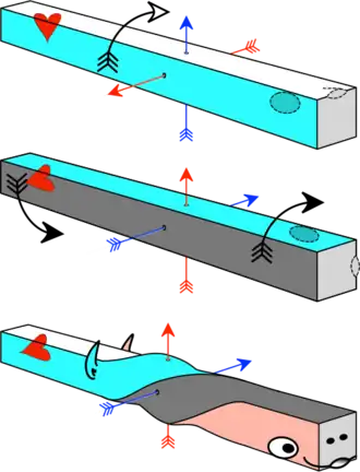![]() Schema of the proposed development of the axial twist. Developmental phases are (from top to bottom): (1) the embryo turns on its left side; (2) the anterior head grows in the same direction, but the rest of the body grows oppositely into a twist. So that ultimately (3) external bilateral symmetry is regained. Note that there is no evolutionary pressure for internal symmetry so the heart (and other organs) remain asymmetric. | |