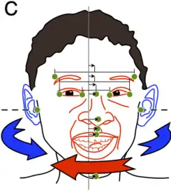 The aurofacial asymmetry expresses the position of the face (eyes, nose, mouth) with respect to the plane perpendicular to the axis through the ears. As shown in the graph, the asymmetry decreases until the age of 13. Since the axial twist is located between the ears and the face, it is predicted that the face grows from the left to the midline, as is indeed the case.[5]