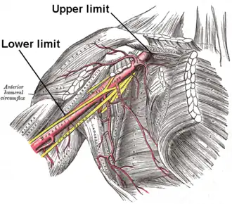 Axillary artery and its branches—anterior view of right upper limb and thorax. Upper and lower limits labeled. | |