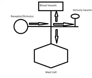The axon reflex[1] (or the flare response)[2] is the response stimulated by peripheral nerves of the body that travels away from the nerve cell body and branches to stimulate target organs. Reflexes are single reactions that respond to a stimulus making up the building blocks of the overall signaling in the body's nervous system. Neurons are the excitable cells that process and transmit these reflex signals through their axons, dendrites, and cell bodies. Axons directly facilitate intercellular communication projecting from the neuronal cell body to other neurons, local muscle tissue, glands and arterioles. In the axon reflex, signaling starts in the middle of the axon at the stimulation site and transmits signals directly to the effector organ skipping both an integration center and a chemical synapse present in the spinal cord reflex. The impulse is limited to a single bifurcated axon,[3] or a neuron whose axon branches into two divisions and does not cause a general response to surrounding tissue.