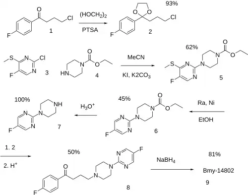 The reaction of 4-chloro-4'-fluorobutyrophenone [3874-54-2] (1) with ethylene glycol gives the ketal, 2-(3-chloropropyl)-2-(4-fluorophenyl)-1,3-dioxolane [3308-94-9] (2). The reaction of 2-chloro-5-fluoro-4-methylthiopyrimidine [87789-51-3] (3) with N-carboethoxypiperazine [120-43-4] (4) gives ethyl-4-(5-fluoro-4-methylthio-2-pyrimidinyl)-1-piperazine carboxylate, PC10470079 (5). Catalytic hydrogenation removes the thiomethyl group giving ethyl-4-(5-fluoro-2-pyrimidinyl)-1-piperazine carboxylate [87789-52-4] (6). Acid hydrolysis of the carbamate protecting group gives a secondary amine and hence 5-fluoro-2-(piperazin-1-yl)pyrimidine [87789-49-9] (7). Alkylation of 2 with 7 and subsequent hydrolysis of the ketal protecting group afforded 1-(4-fluorophenyl)-4-(4-(5-fluoro-2-pyrimidinyl)-1-piperazinyl)butan-1-one [133982-66-8] (8). Lastly, reduction of the benzoyl ketone with sodium borohydride gave the alcohol, completing the synthesis of BMY-14802 (9).