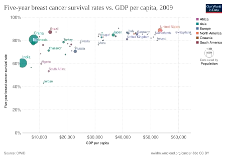 A 25-year-old woman with no mutation in her BRCA genes has an 84% probability to reach at least the age of 70.[17] Of those not surviving, 11% die from either breast or ovarian cancer, and 89% from other causes.