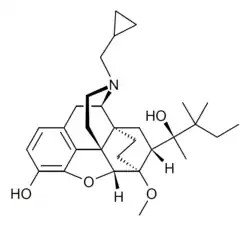 - ↑ Khroyan TV, Polgar WE, Cami-Kobeci G, Husbands SM, Zaveri NT, Toll L (March 2011). "The first universal opioid ligand, (2S)-2-[(5R,6R,7R,14S)-N-cyclopropylmethyl-4,5-epoxy-6,14-ethano-3-hydroxy-6-methoxymorphinan-7-yl]-3,3-dimethylpentan-2-ol (BU08028): characterization of the in vitro profile and in vivo behavioral effects in mouse models of acute pain and cocaine-induced reward". The Journal of Pharmacology and Experimental Therapeutics. 336 (3): 952–61. doi:10.1124/jpet.110.175620. PMC 3061529. PMID 21177476.