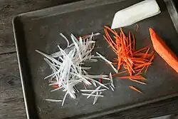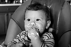 Initially, foods should be soft enough that the food can be easily mashed between the tongue and the roof of the mouth, without chewing the food before swallowing.[6] Harder foods, such as root vegetables, need to be cooked to make them soft enough for the baby's level of development (e.g., whether the baby's teeth have come in). Non-finger-foods, such as oatmeal and yogurt, may be offered on a pre-loaded spoon so the baby can learn to self-feed with a spoon.[8]