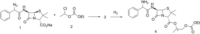 An azidopenicillin sodium salt (1) is reacted with mixed carbonate ester 2 (itself prepared from acetaldehyde and ethyl chloroformate) to give ester 3. Reduction of the azido linkage with hydrogen and a suitable catalyst produces bacampillin (4). Both enantiomers are active. The drug is rapidly absorbed from the gastrointestinal tract and is quickly cleaved by serum esterases to bioactive ampicillin, acetaldehyde, CO2 and ethanol.