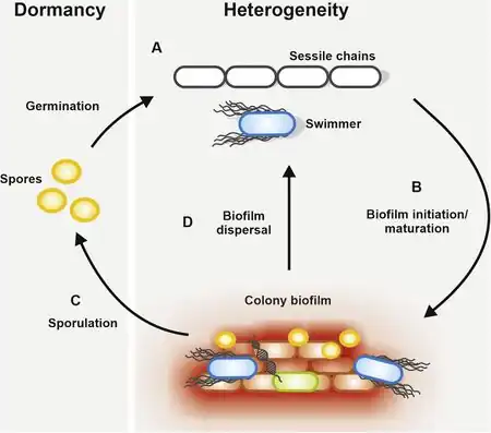 - ↑ Higgins D, Dworkin J (January 2012). "Recent progress in Bacillus subtilis sporulation". FEMS Microbiology Reviews. 36 (1): 131–148. doi:10.1111/j.1574-6976.2011.00310.x. PMC 3237856. PMID 22091839.