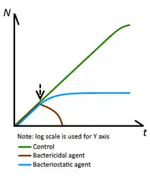 A bacteriostatic agent or bacteriostat, abbreviated Bstatic, is a biological or chemical agent that stops bacteria from reproducing, while not necessarily killing them otherwise. Depending on their application, bacteriostatic antibiotics, disinfectants, antiseptics and preservatives can be distinguished. When bacteriostatic antimicrobials are used, the duration of therapy must be sufficient to allow host defense mechanisms to eradicate the bacteria. Upon removal of the bacteriostat, the bacteria usually start to grow rapidly. This is in contrast to bactericides, which kill bacteria.[1]