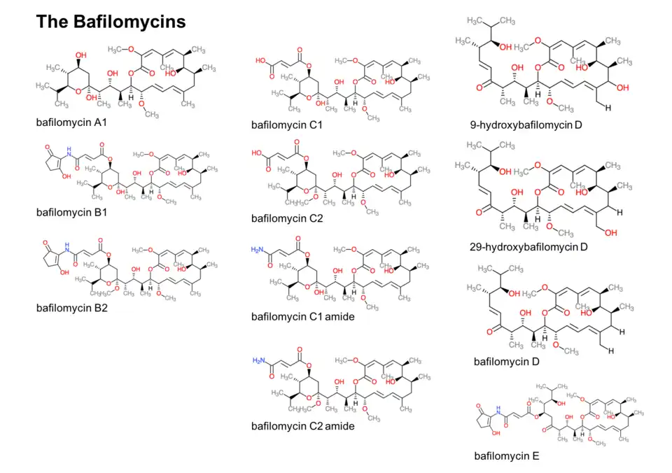 As one of the first identified and most commonly used, bafilomycin A1 is of particular importance, especially as its structure serves as the core of all other bafilomycins. With its large structure, bafilomycin has multiple chiral centers and functional groups, which makes modifying its structure difficult, a task that has been attempted to reduce the compound's associated toxicity.[11]