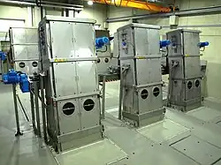 A bar screen is a mechanical filter used to remove large objects, such as rags and plastics, from wastewater.[1] It is part of the primary filtration flow and typically is the first, or preliminary, level of filtration, being installed at the influent to a wastewater treatment plant. They typically consist of a series of vertical steel bars spaced between 1 and 3 inches apart.[2]