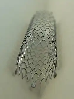 A bare-metal stent is a stent made of thin, uncoated (bare) metal wire that has been formed into a mesh-like tube. The first stents licensed for use in cardiac arteries were bare metal – often 316L stainless steel. More recent "second generation" bare-metal stents have been made of cobalt chromium alloy.[1] While plastic stents were first used to treat gastrointestinal conditions of the esophagus, gastroduodenum, biliary ducts, and colon, bare-metal stent advancements led to their use for these conditions starting in the 1990s.[2]