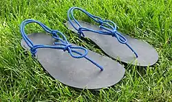 The alternative to going barefoot is to wear thin shoes with minimal padding. This is what runners wore for thousands of years before the 1980s when the modern running shoe was invented. Shoes, such as moccasins or thin sandals, permit a similar gait as barefoot, but protect the feet from cuts, abrasion and soft sticky matter.[1] The Tarahumara wear thin-soled sandals known as huaraches.[6] These sandals have a single long lace with a thin sole made from either recycled tires, commercially available replacement outsole rubber, or leather. The practice of wearing light or no shoes while running may be termed "minimalist running".[26]