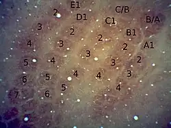 The barrels that correspond to the major facial whiskers (mystacial vibrissae) are contained within the posteromedial barrel subfield (PMBSF). The barrels here are the largest and most elliptical in shape and have a striking topographical organization that is identical to that of the whiskers; they are organized into 5 rows of 4-7 large whiskers that run close to parallel with the bridge of the nose.[6] The organisation of the mystacial vibrissae and corresponding barrels is so consistent that there is a naming convention to identify each whisker in rats and mice. Rows are designated A to E from top to bottom, and columns of whiskers within each row are numbered from back to front. The first four rows also have an additional whisker behind column 1, which is designated with a lower case letter or a Greek letter (α, β, γ, or δ). These four whiskers are also called straddlers.