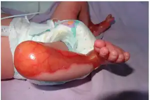 - Absence of skin at birth, involving the lower legs and feet, healing within a few months, leaving scarring and fragile skin.