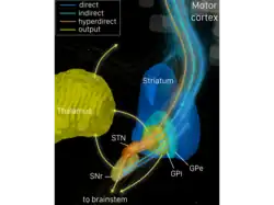 33. 1 2 Silkis I (January 2001). "The cortico-basal ganglia-thalamocortical circuit with synaptic plasticity. II. Mechanism of synergistic modulation of thalamic activity via the direct and indirect pathways through the basal ganglia". Bio Systems. 59 (1): 7–14. Bibcode:2001BiSys..59....7S. doi:10.1016/s0303-2647(00)00135-0. PMID 11226622.