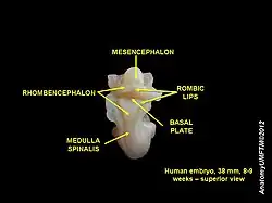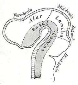 In the developing nervous system, the basal plate is the region of the neural tube ventral to the sulcus limitans. It extends from the rostral mesencephalon to the end of the spinal cord and contains primarily motor neurons, whereas neurons found in the alar plate are primarily associated with sensory functions. The cell types of the basal plate include lower motor neurons and four types of interneuron.[1]