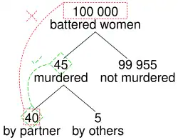 In the same trial, the prosecution presented evidence that Simpson had been violent toward his wife. The defense argued that there was only one woman murdered for every 2500 women who were subjected to spousal abuse, and that any history of Simpson being violent toward his wife was irrelevant to the trial. However, the reasoning behind the defense's calculation was fallacious. According to author Gerd Gigerenzer, the correct probability requires additional context: Simpson's wife had not only been subjected to domestic violence, but rather subjected to domestic violence (by Simpson) and killed (by someone). Gigerenzer writes "the chances that a batterer actually murdered his partner, given that she has been killed, is about 8 in 9 or approximately 90%".[16] While most cases of spousal abuse do not end in murder, most cases of murder where there is a history of spousal abuse were committed by the spouse.