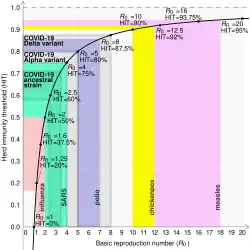The most important uses of are determining if an emerging infectious disease can spread in a population and determining what proportion of the population should be immunized through vaccination to eradicate a disease. In commonly used infection models, when the infection will be able to start spreading in a population, but not if . Generally, the larger the value of , the harder it is to control the epidemic. For simple models, the proportion of the population that needs to be effectively immunized (meaning not susceptible to infection) to prevent sustained spread of the infection has to be larger than .[8] This is the so-called herd immunity threshold or herd immunity level. Here, herd immunity means that the disease cannot spread in the population because each infected person, on average, can only transmit the infection to less than one other contact.[9] Conversely, the proportion of the population that remains susceptible to infection in the endemic equilibrium is . However, this threshold is based on simple models that assume a fully mixed population with no structured relations between the individuals. For example, if there is some correlation between people's immunization (e.g., vaccination) status, then the formula may underestimate the herd immunity threshold.[9]