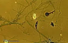 Basidiobolus ranarum is a filamentous fungus with worldwide distribution.[1] The fungus was first isolated by Eidam in 1886. It can saprophytically live in the intestines of mainly cold-blooded vertebrates and on decaying fruits and soil. The fungus prefers glucose as a carbon source and grows rapidly at room temperature.[2] Basidiobolus ranarum is also known as a cause of subcutaneous zygomycosis,[3][4] usually causing granulomatous infections on a host's limbs.[5] Infections are generally geographically limited to tropical and subtropical regions such as East and West Africa.[6] Subcutaneous zygomycosis caused by B. ranarum is a rare disease and predominantly affects children and males.[5] Common subcutaneous zygomycosis shows characteristic features and is relatively easy to be diagnosed; while, certain rare cases might show non-specific clinical features that might pose a difficulty on its identification.[7] Although disease caused by this fungus is known to resolve spontaneously on its own, there are a number of treatments available.[8]