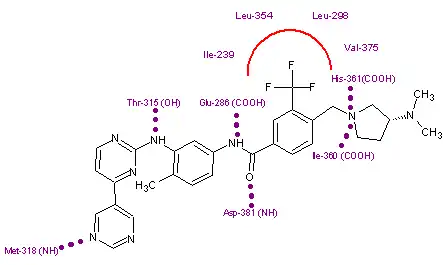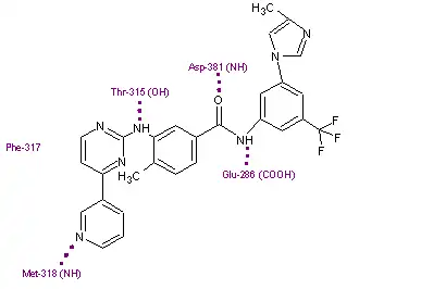 Imatinib binds to Abl domain via six hydrogen bond interactions. This stabilizes the imatinib Bcr-Abl complex and prevents ATP from reaching its binding site.[6][10][12] The hydrogen bonds involve the pyridine-N and backbone-NH of Met-318, the aminopyrimidine and side chain hydroxyl of Thr-315, the amide-NH and side chain carboxylate of Glu-286, the carbonyl and backbone-NH of Asp-381, the protonated methylpiperazine with the backbone-carbonyl atoms of Ile-360 and His-361. Additionally, a number of van der Waals interactions contribute to binding.[10] A hydrophobic pocket is formed by amino acid residues Ile-293, Leu-298, Leu-354 and Val-379 around the phenyl ring adjacent to the piperazinyl-methyl group of imatinib.[12] At the time of its discovery, in the absence of structural information, no clear explanation for the impressive selectivity of imatinib could be found.[8]