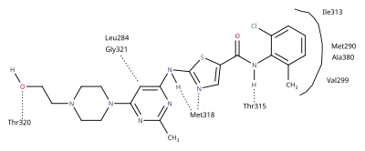 Dasatinib has some structural elements in common with nilotinib, in particular the juxtaposition of the aminopyrimidine and the carboxamide groups. The aminothiazole segment of dasatinib makes a bi-dentate H-bonding interaction with the backbone CO and NH of Met-318 and the amide-NH makes an H-bond with the side chain oxygen of Thr-315.[13]