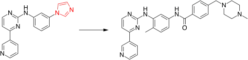 In the development of imatinib, the structure of Bcr-Abl tyrosine kinase played a limited role because it was unknown.[9] A high-throughput screening of chemical libraries at Novartis was performed to identify a starting molecule, which was called "Pyrimidine A". This compound served as a lead compound and was then tested and modified to develop imatinib.[11] With a replacement of the imidazole group with a benzamido group, the compound's specificity increased while its activity as a kinase inhibitor remained the same. Subsequently, introducing a methyl substituent ortho to the pyrimidinyl-amino group enhanced the potency.[6]
