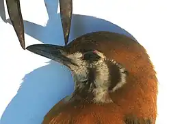 Rictal bristles are stiff hair-like feathers that arise around the base of the beak.[68] They are common among insectivorous birds, but are also found in some non-insectivorous species.[69] Their function is uncertain, although several possibilities have been proposed.[68] They may function as a "net", helping in the capture of flying prey, although to date, there has been no empirical evidence to support this idea.[70] There is some experimental evidence to suggest that they may prevent particles from striking the eyes if, for example, a prey item is missed or broken apart on contact.[69] They may also help to protect the eyes from particles encountered in flight, or from casual contact from vegetation.[70] There is also evidence that the rictal bristles of some species may function tactilely, in a manner similar to that of mammalian whiskers (vibrissae). Studies have shown that Herbst corpuscles, mechanoreceptors sensitive to pressure and vibration, are found in association with rictal bristles. They may help with prey detection, with navigation in darkened nest cavities, with the gathering of information during flight or with prey handling.[70]