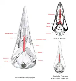The base of the upper mandible, or the roof when seen from the mouth, is the palate; the palate's structure differs greatly in the ratites. Here, the vomer is large and connects with premaxillae and maxillopalatine bones in a condition termed as a "paleognathous palate". All other extant birds have a narrow forked vomer that does not connect with other bones and is then termed as neognathous. The shape of these bones varies across the bird families.[a]