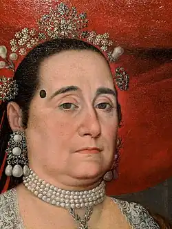 The wearing of artificial beauty marks trace back to the Roman Empire; it was believed that the Goddess of beauty, Venus, had a single beauty mark that accentuated her beauty.[3] As such, beauty patches became a recognizable symbol of beauty designed to highlight the pale, unblemished skin of the wearer.[4] In Europe, mouches (French, 'flies'), became fashionable in sixteenth-century France, and the fashion persisted into the eighteenth century. When the fashion spread to Spain and the Spanish Empire they were called a chiqueador.[5]