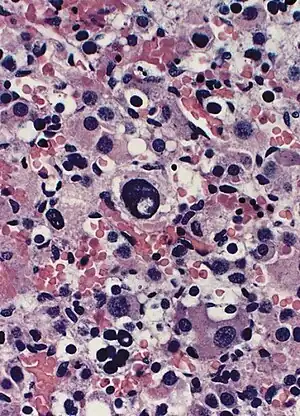 | Adrenal gland: Beckwith-Wiedemann syndrome Nuclear enlargement and hyperchromasia with nuclear "pseudoinclusion" near the center of field. Mitotic figures were not identified. | |