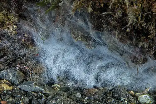 Beggiatoa is a genus of Gammaproteobacteria belonging to the order Thiotrichales, in the Pseudomonadota phylum. These bacteria form colorless filaments composed of cells that can be up to 200 μm in diameter, and are one of the largest prokaryotes on Earth.[3] Beggiatoa are chemolithotrophic sulfur-oxidizers, using reduced sulfur species as an energy source. They live in sulfur-rich environments such as soil, both marine and freshwater, in the deep sea hydrothermal vents, and in polluted marine environments. In association with other sulfur bacteria, e.g. Thiothrix, they can form biofilms that are visible to the naked eye as mats of long white filaments; the white color is due to sulfur globules stored inside the cells.