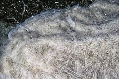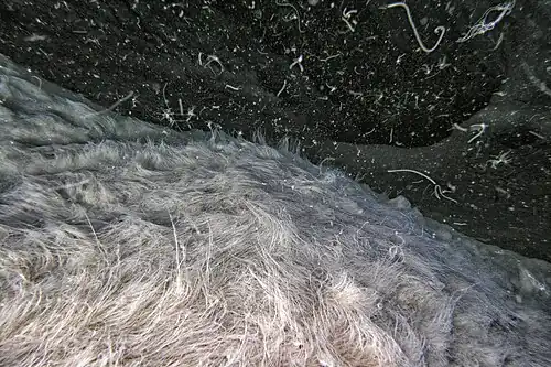 Filaments have been observed to form dense mats on sediments in a very huge variety of environments. They appear as a whitish layer and since they are present and flourish in marine environments which have been subject to pollution, they can be considered as an indicator species.[22] Beggiatoa and other related filamentous bacteria can cause settling problems in sewage treatment plants, industrial waste lagoons in canning, paper pulping, brewing, milling, causing the phenomenon called "bulking". Beggiatoa are also able to detoxify hydrogen sulfide in soil and have a role in the immobilization of heavy metals.[23][24]