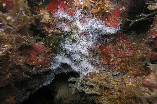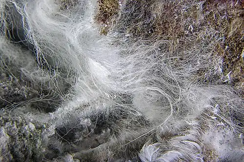 Beggiatoa is also found in salt marshes, saline, and geothermally active underwater caves. Some studies on these environments have been carried out in the underwater caves of dolomitized limestone in Capo Palinuro, Salerno, (Italy). Here there are hydrothermal sulphidic springs and microbial biofilm is associated with the flow of hydrothermal fluids, whose activity is intermittent and starts during low tide. Mats found in the caves were composed by filaments resembling in most part Beggiatoa, Thiothrix and Flexibacter, and this Beggiatoa-like filaments were morphologically close to those found attached to rocks and the byssus of the mussels from Lucky Strike Hydrothermal vents on the Mid-Atlantic Ridge.[3]