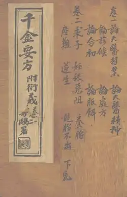 Beiji qianjin yaofang (traditional Chinese: 備急千金要方; simplified Chinese: 备急千金要方; pinyin: Bèijí qiānjīn yàofāng),[a] literally Essential Formulas Worth a Thousand in Gold for Emergencies,[2] is a Chinese medical text by Tang-dynasty physician Sun Simiao, first published in 652. A sequel was published in 682.