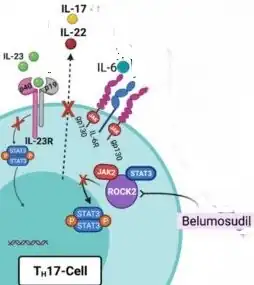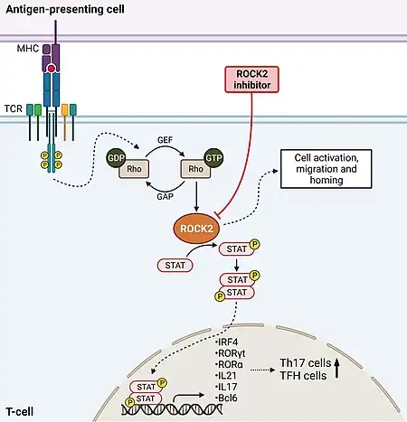 - ↑ Zanin-Zhorov A, Weiss JM, Trzeciak A, Chen W, Zhang J, Nyuydzefe MS, et al. (May 2017). "Cutting Edge: Selective Oral ROCK2 Inhibitor Reduces Clinical Scores in Patients with Psoriasis Vulgaris and Normalizes Skin Pathology via Concurrent Regulation of IL-17 and IL-10". Journal of Immunology. 198 (10): 3809–3814. doi:10.4049/jimmunol.1602142. PMC 5421306. PMID 28389592.